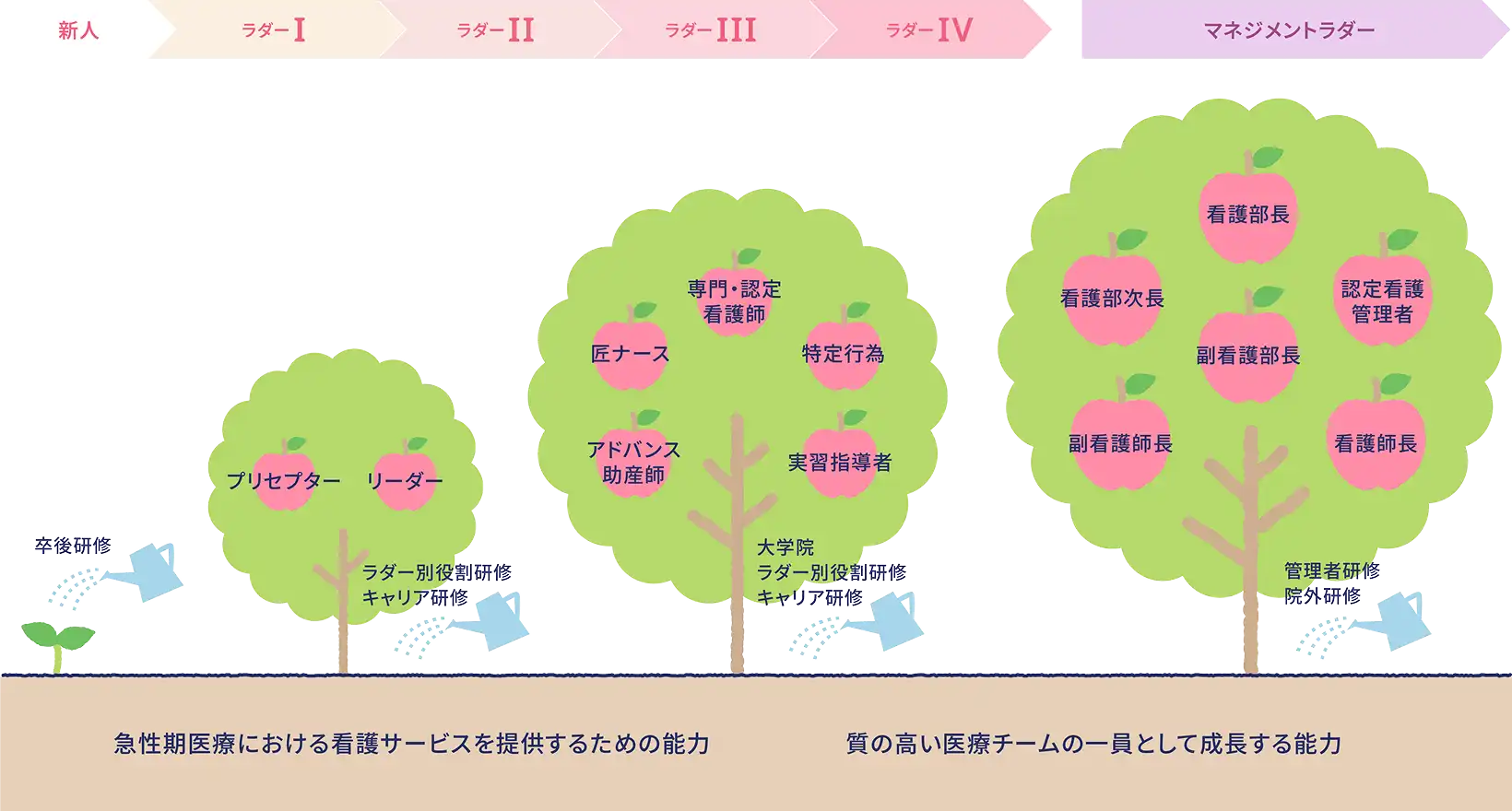 これらの教育理念のもと、急性期医療に携わる看護職として各々が持つ潜在的な能力を開発することで発展させ、専門職業人として自己啓発できる看護職の育成を図ることを目的に看護実践能力習熟段階(ラダー)を設定しています。