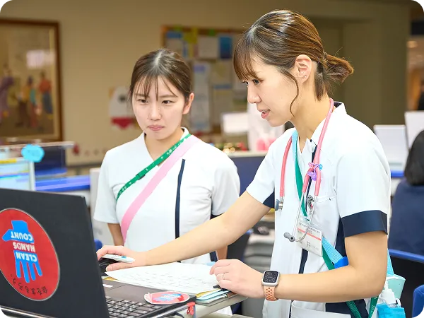 新卒看護師が部署に配属された直後から夜勤が始まるまでの約3か月間、実務経験豊富な匠ナースが、日常生活援助技術や看護技術を指導します。またその後9か月間、プリセプターと共に継続して新人教育に携わります。