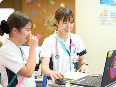 2歳と5歳の子どもを育てながら働いていますが、子どもの体調不良などによる急な休みや勤務変更にも、快く対応してもらえる職場です。お迎えに間に合うよう声をかけてもらったり、部分休業を活用して送り迎えができたりと、子育てと仕事を両立しやすい環境が整っています。特に、小児病棟には子育て中の看護師が多く、お互いに助け合っています。